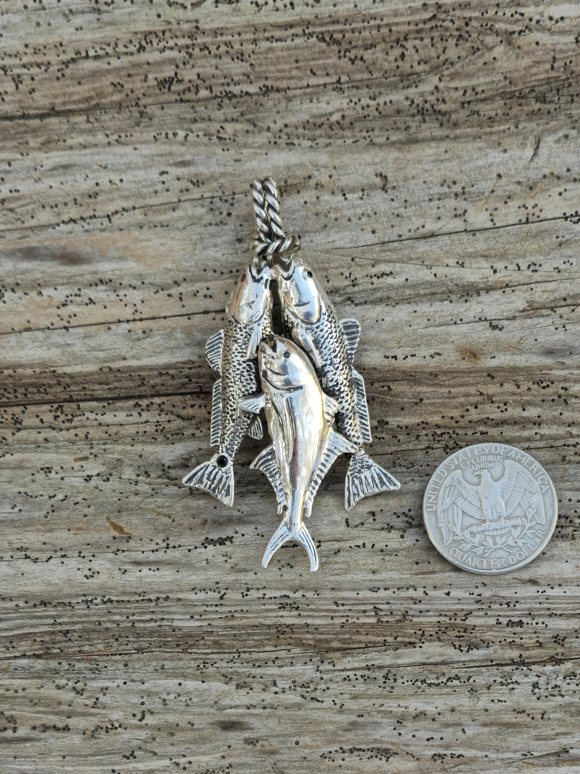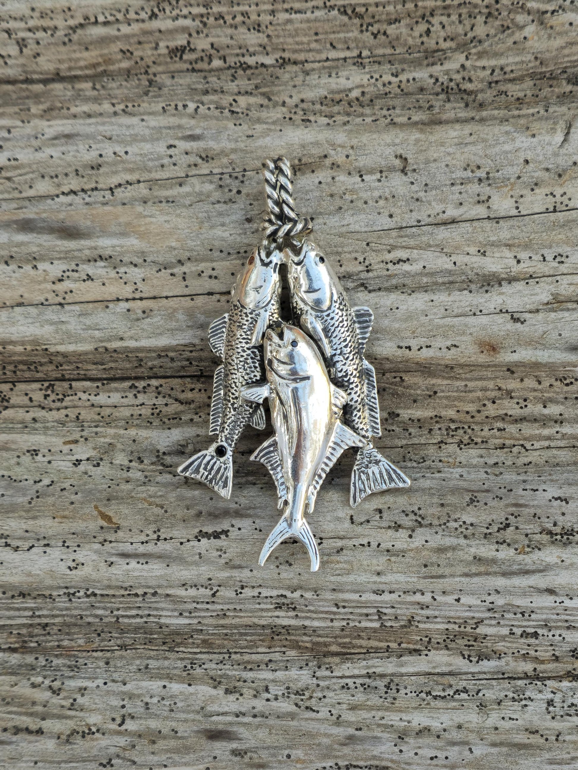 This pendant is crafted from 92.5% sterling silver. It features a beautifully redfish and a black drum with textured scales and signature tail spots, alongside a Crevalle Jack with lifelike dotted patterns. Expert craftsmanship and elegant details make this piece perfect for fishing enthusiasts and admirers of nature-inspired jewelry. Unlike most jewelry companies, we take pride in handcrafting each order as it is received. The time and care we invest in creating quality jewelry ensure that every piece you receive reflects our dedication to excellence from the very first look.
