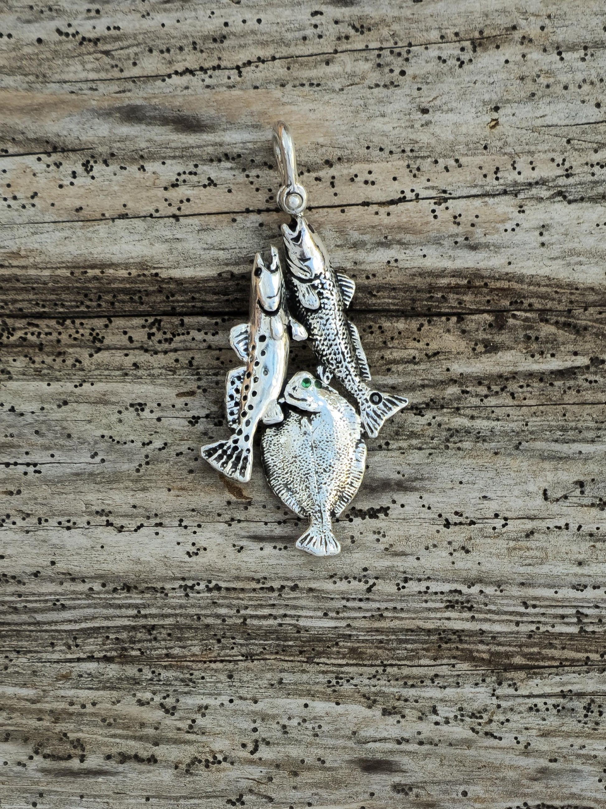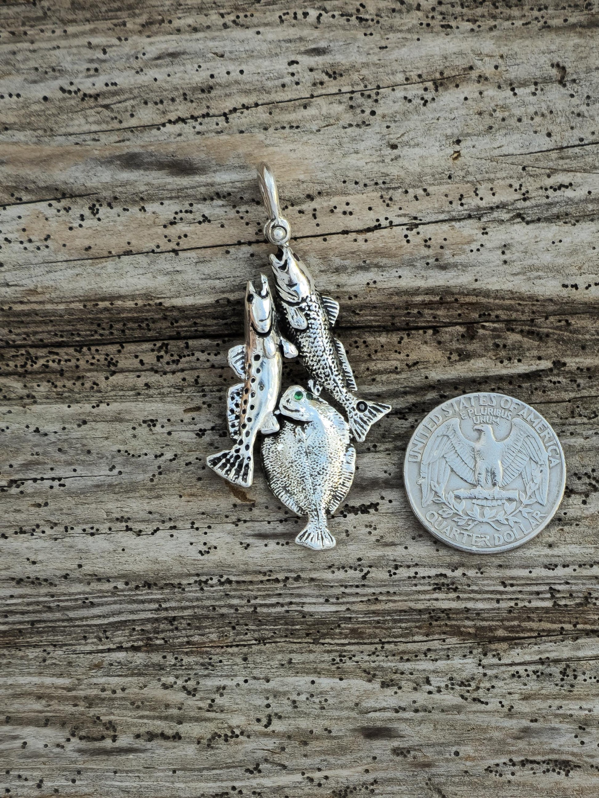 This pendant is crafted from 92.5% sterling silver. It features three intricately detailed fish: a trout with signature dotted patterns, a redfish showcasing textured scales and a tail spot, and a central flounder with its distinctive flat, rounded body. Accented with a subtle gemstone near the flounder's eye, this pendant captures the beauty of aquatic life, making it perfect for fishing enthusiasts and nature-inspired jewelry collectors. Unlike most jewelry companies, we take pride in handcrafting each order as it is received. The time and care we invest in creating quality jewelry ensure that every piece you receive reflects our dedication to excellence from the very first look.