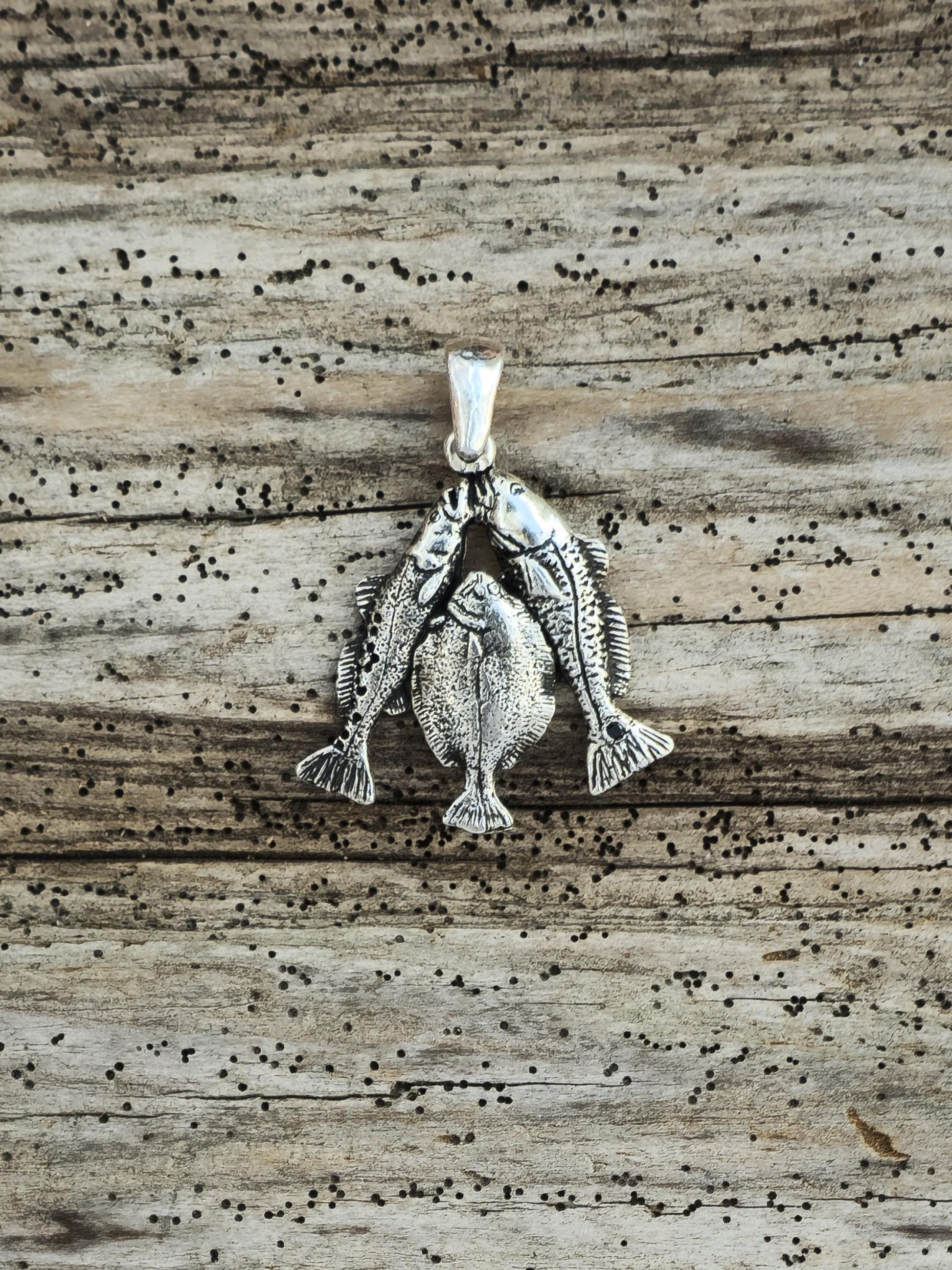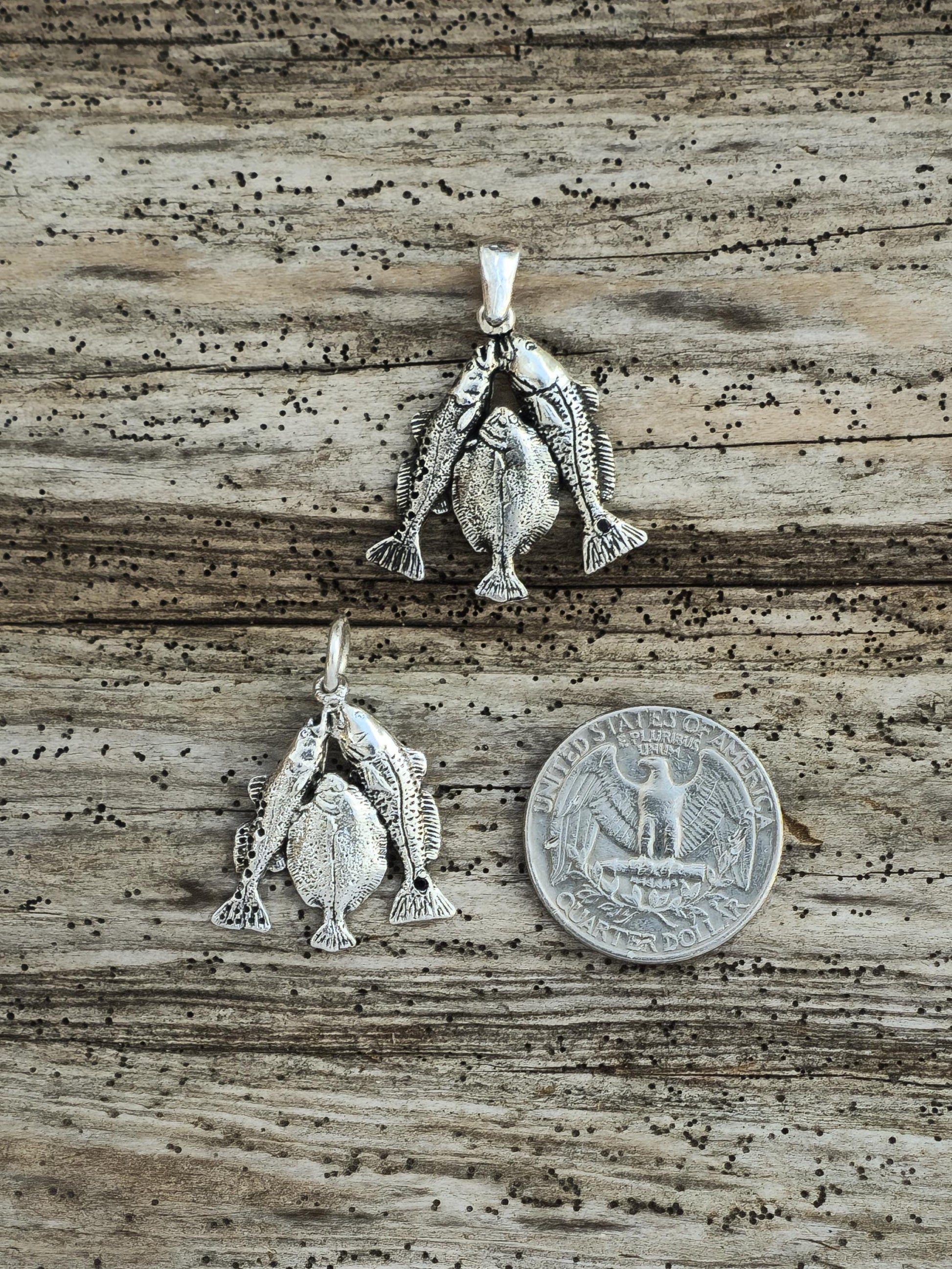 This pendant is crafted from 92.5% sterling silver. It features three lifelike fish: a trout with dotted patterns, a redfish with textured scales and a tail spot, and a flounder at the center, showcasing its distinctive flat, rounded body. Expertly crafted with intricate details, this pendant is a stunning tribute to aquatic life, perfect for fishing enthusiasts and admirers of nature-inspired jewelry. Unlike most jewelry companies, we take pride in handcrafting each order as it is received. The time and care we invest in creating quality jewelry ensure that every piece you receive reflects our dedication to excellence from the very first look.