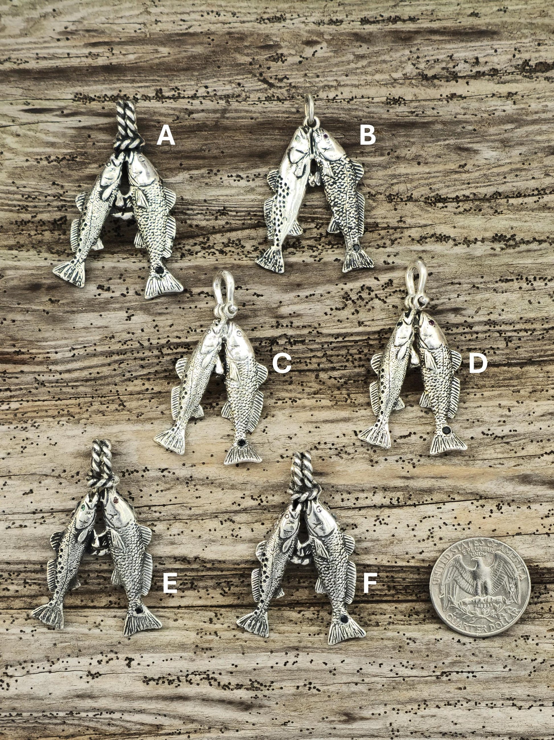 This pendant is crafted from 92.5% sterling silver. It features two finely crafted fish: one trout, with smooth dotted patterns, and one redfish (red drum), showcasing textured scales and a distinctive tail spot. Elegant gemstone accents near the eyes enhance the lifelike detail, making this piece perfect for fishing enthusiasts and nature-inspired jewelry admirers. Unlike most jewelry companies, we take pride in handcrafting each order as it is received. The time and care we invest in creating quality jewelry ensure that every piece you receive reflects our dedication to excellence from the very first look. Please choose your preferred design.